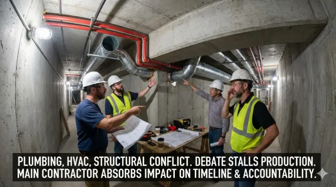 Example: the plumbing subcontractor claims they installed according to shop drawings. HVAC says their route is critical. Structural insists no additional penetrations are allowed. The situation turns into debate instead of production—yet the main contractor absorbs the impact on timeline and accountability.