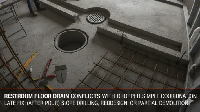 Example: in a restroom area, the floor drain location conflicts with a dropped beam. If identified early, it’s a simple coordination fix—adjust routing, elevation, or slope. But if discovered after concrete is poured, the options become painful: core drilling, redesigning slopes, or partial demolition.
