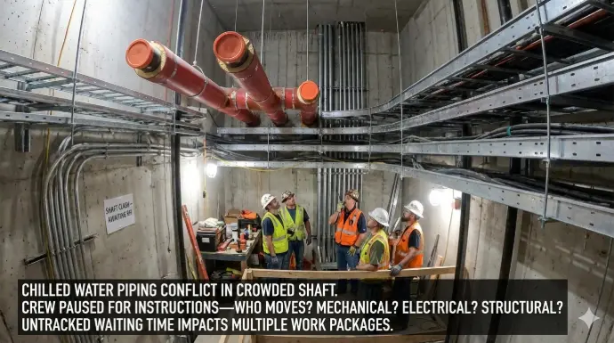 Example: chilled water piping needs to pass through a shaft that turns out to be crowded with cable trays and other risers. The crew pauses, waiting for instructions—who moves? Mechanical? Electrical? Structural? That waiting time rarely gets tracked properly, but its impact spreads across multiple work packages.