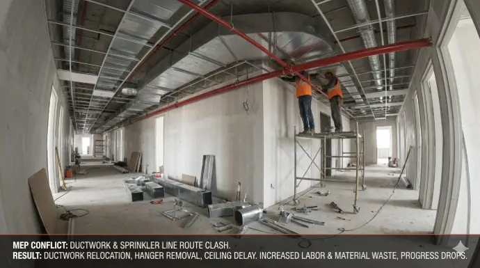 A real example: the MEP team installs ductwork along a corridor ceiling. Later, the sprinkler line is found to require the same route. The result? Ductwork needs to be relocated, hangers removed, ceiling work delayed. Labor cost increases, materials are wasted, and progress drops.
